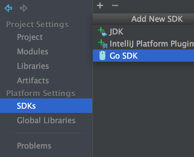 File->Project Structure...,找不到的随便打开一个项目就能看到。点击SDKS,新建一个GO SDK,填上GO的安装目录。