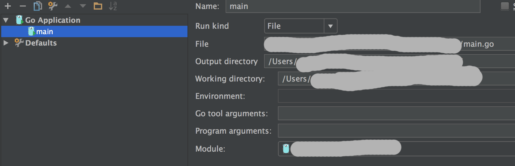 使用:随便新建一个Go项目,点击Edit Configurations...,新建一个Go Application,右边File你的pack main包含func main的文件,Output directory为编译后的文件输出目录。新建完毕后,选择新建的Debug选项就可以编译、运行程序了。